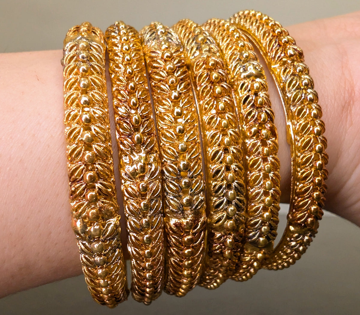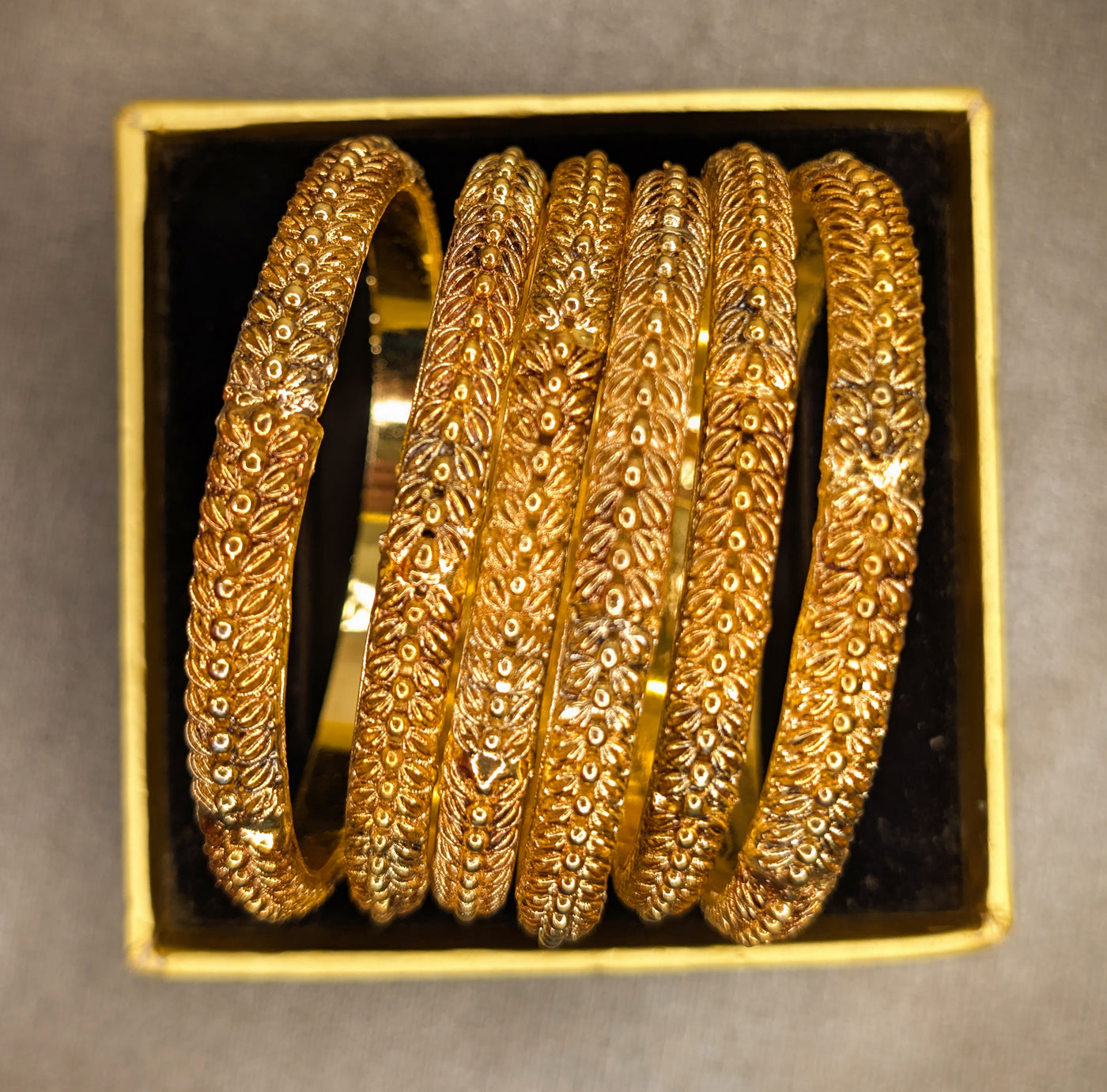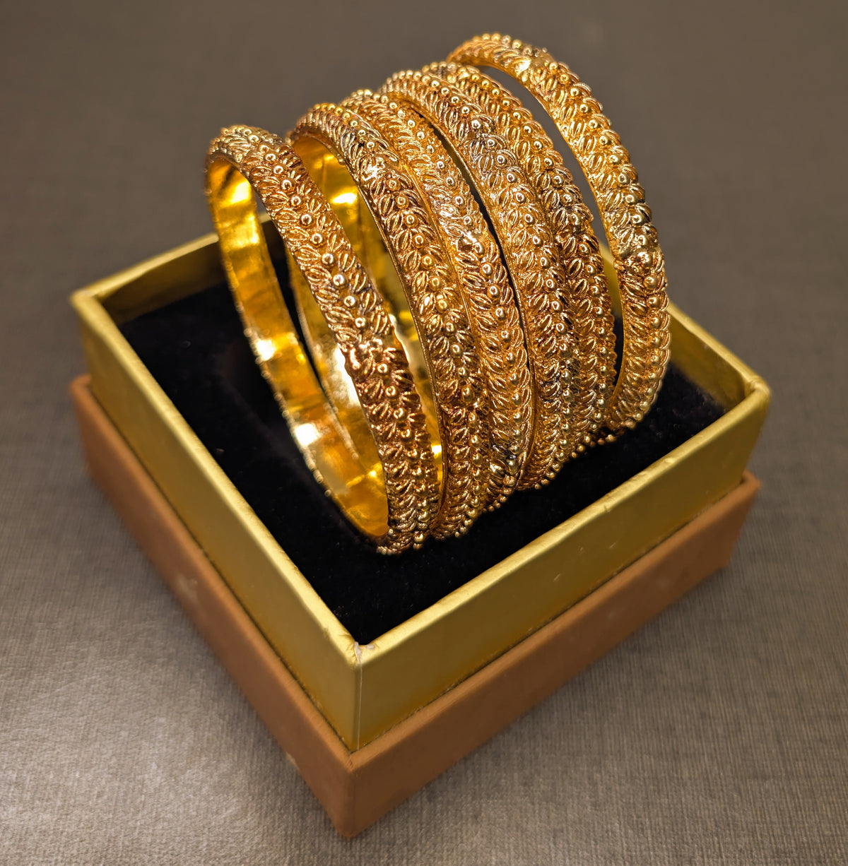 Each piece is plated with premium gold tone, ensuring it keeps its glow for months to come. Whether it’s your wedding day or a cherished event, these bangles complete your look with royal finesse.